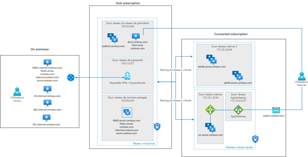 Lorsque vous mettez en œuvre un cloud hybride, il est nécessaire de s’assurer que les charges de travail sur site peuvent résoudre les adresses des charges de travail dans le cloud, et que les charges de travail dans le cloud peuvent résoudre les adresses des charges de travail sur site.