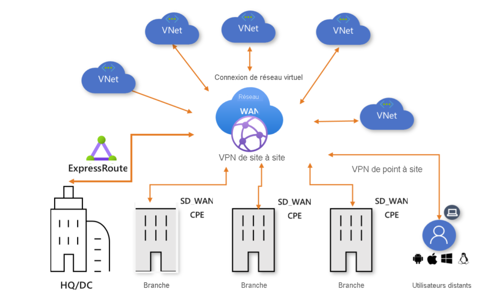 Il offre une topologie dans laquelle chaque bureau et centre de données dispose d’une connexion VPN ou ExpressRoute vers Azure. Le service Azure Virtual WAN gère le routage du trafic entre les différents emplacements.