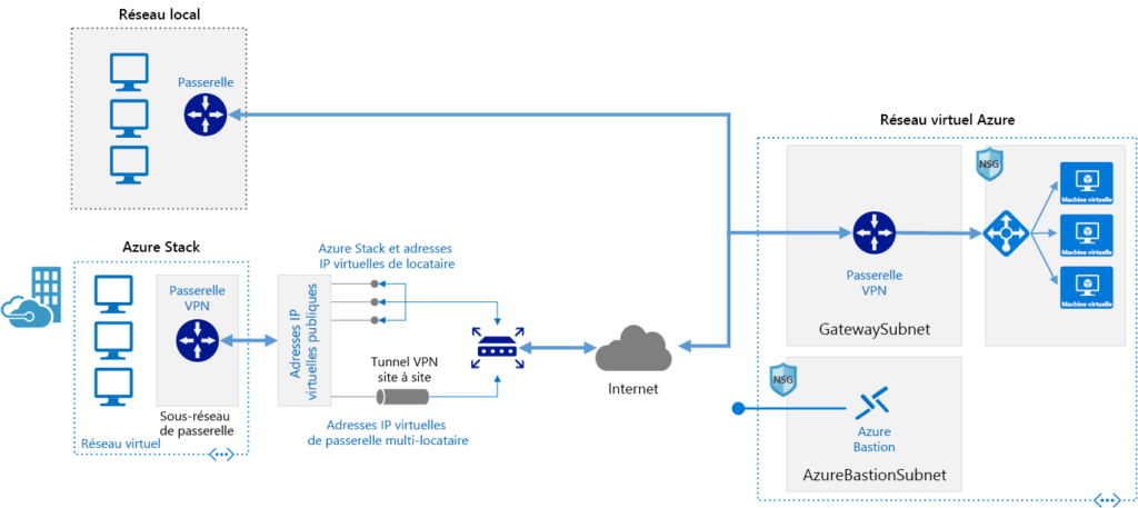 Une passerelle VPN Azure vous permet de connecter votre réseau sur site à Azure en utilisant un tunnel VPN sécurisé via l’internet public. Les connexions VPN Azure sont similaires aux connexions VPN traditionnelles qui peuvent exister entre un bureau régional et le siège.