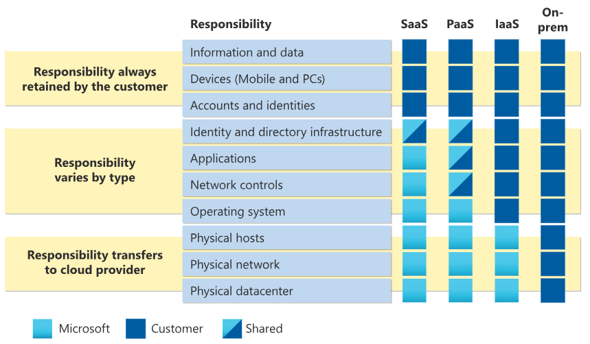 - Appareils clients – Dans les scénarios SaaS, Microsoft peut fournir certaines capacités de gestion des appareils, mais vous êtes responsable de la protection des terminaux et de la conformité.