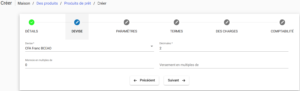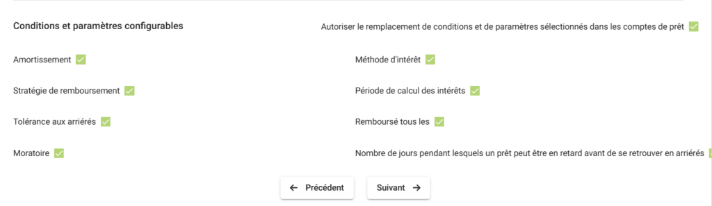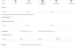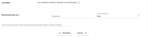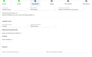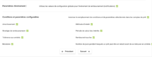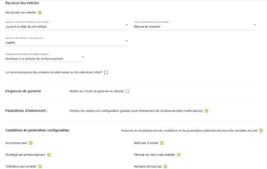- Paramètres : Remboursement (fréquence, méthode de calcul)
