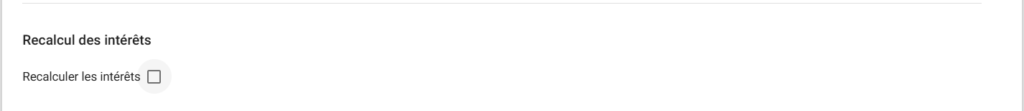 En cochant la case « Recalculer les intérêts », vous activez le recalcul automatique des intérêts. Pour plus d’informations, consultez la section Recalcul du montant des intérêts pour les comptes de prêt.
