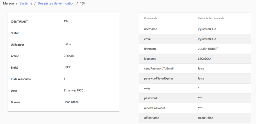 Une page détaillant l’entrée d’audit s’affichera, comme illustré dans l’exemple ci-dessous :