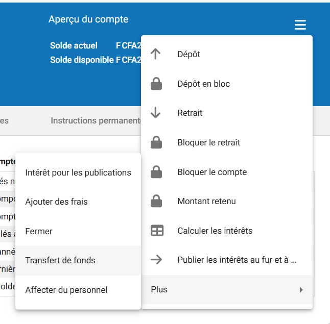 - Sur la page du compte d’épargne, cliquez sur le Menu Hamburger >> Plus >> Transférer des fonds