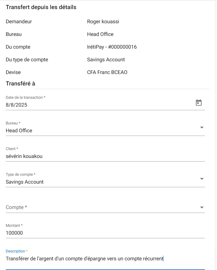 Le montant du transfert sera retiré du compte d’origine, transféré vers le compte de destination, et le solde du compte d’origine sera mis à jour immédiatement.