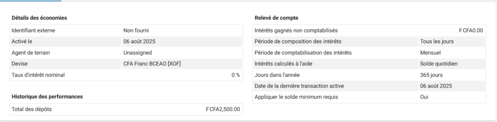 Pour transférer des fonds depuis un compte d’épargne, Localisez le compte d’épargne en accédant au client, au groupe ou au centre qui détient le compte, puis cliquez sur le compte d’épargne dans la section Vue d’ensemble des comptes d’épargne (le compte d’origine).