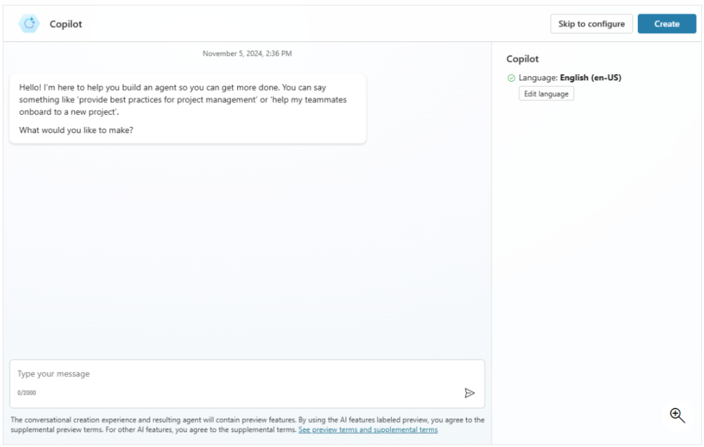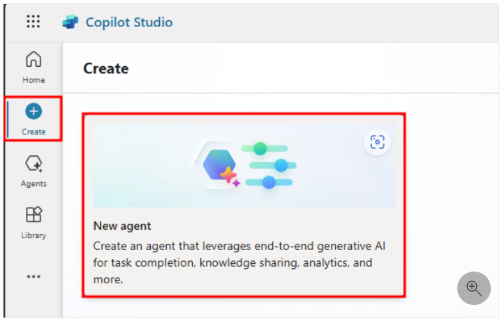 Si vous souhaitez créer un agent à partir de zéro, vous pouvez accéder à l’onglet + Créer depuis la barre de navigation gauche de Microsoft Copilot Studio.