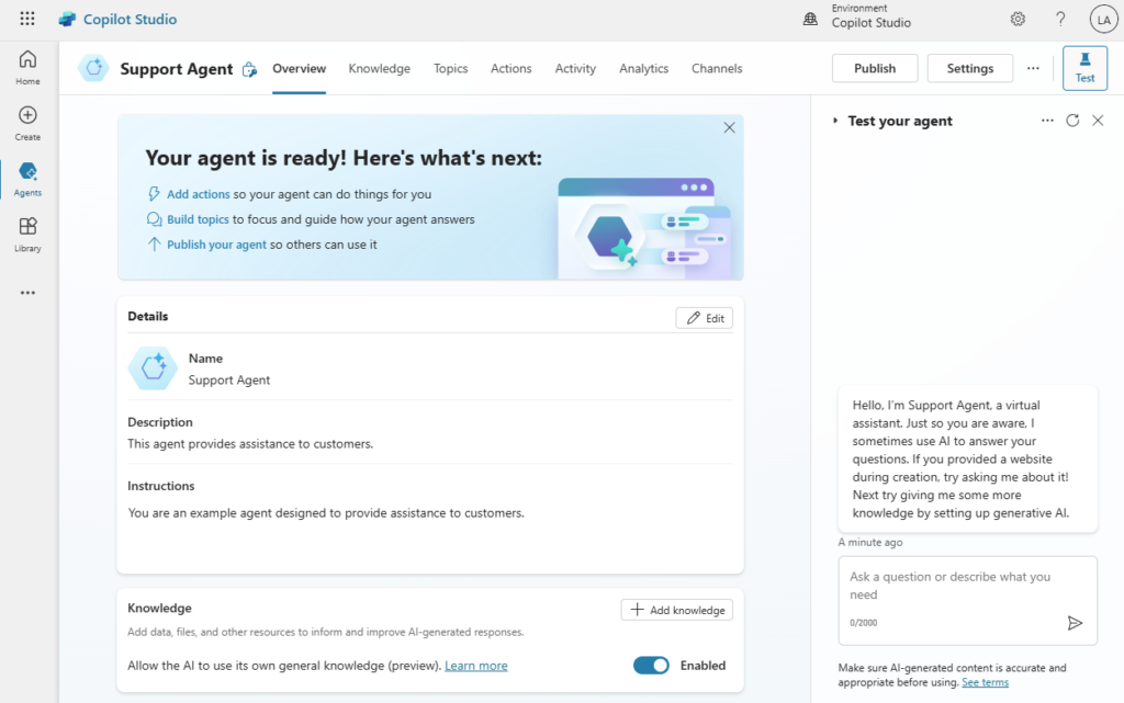 - Panneau de test de votre agent – Vous permet de tester votre agent en tant qu’utilisateur final pour vous assurer qu’il fonctionne comme prévu.