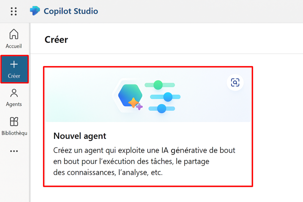 Si vous souhaitez créer un agent à partir de zéro, vous pouvez accéder à l’onglet + Créer depuis la barre de navigation gauche de Microsoft Copilot Studio.