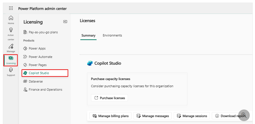 Pour afficher les informations d’utilisation et de facturation de Copilot Studio, connectez-vous au centre d’administration Power Platform et accédez à l’onglet Licences depuis le menu de navigation de gauche. Dans le volet Licences qui s’ouvre à gauche, sélectionnez Copilot Studio.