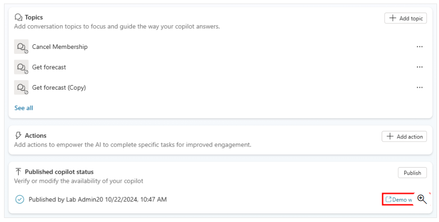 Avant que l’agent ne soit déployé sur les différents canaux qui l’utilisent, vous pouvez souhaiter obtenir des retours d’autres membres de l’équipe. Lorsqu’un agent est publié pour la première fois, il peut être rendu disponible sur le site de démonstration. Vous pouvez fournir l’URL du site de démonstration aux membres de l’équipe ou aux parties prenantes pour qu’ils l’essaient. L’avantage d’utiliser le site de démonstration est que l’expérience est différente de celle du test de l’agent pendant la phase de conception. L’expérience de test de l’agent est uniquement destinée à permettre aux auteurs d’agents de le tester. Ainsi, le lien du site de démonstration augmente le nombre d’utilisateurs pouvant tester et fournir des retours liés à l’expérience globale de l’agent.