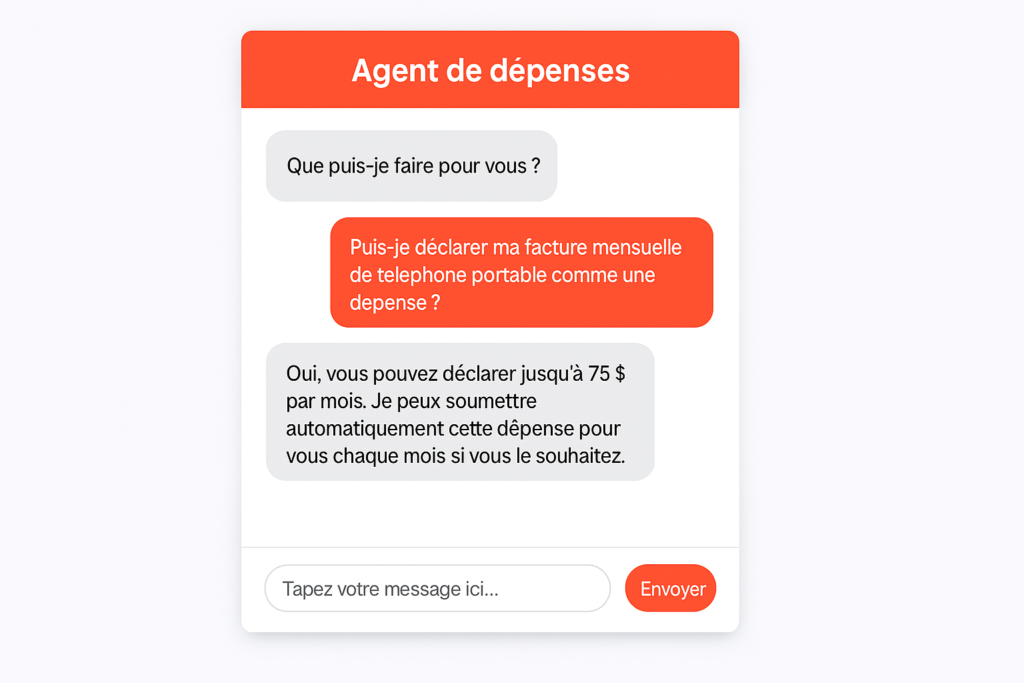 De plus, l’agent pourrait utiliser des fonctions programmatiques pour soumettre automatiquement des demandes de remboursement pour des dépenses récurrentes, telles que les factures mensuelles de téléphone portable, ou acheminer intelligemment les dépenses vers l’approbateur approprié en fonction des montants réclamés.