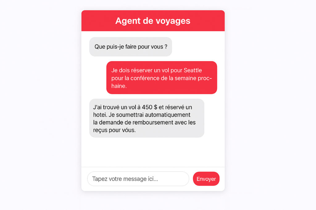 Dans des scénarios plus complexes, les organisations peuvent développer des solutions multi-agents où plusieurs agents coordonnent le travail entre eux. Par exemple, un agent de réservation de voyages pourrait réserver des vols et des hôtels pour les employés et soumettre automatiquement les demandes de remboursement avec les justificatifs appropriés à l’agent des dépenses — créant ainsi un flux de travail intégré qui couvre plusieurs processus métier.